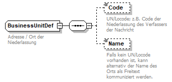 source | <xsd:complexType name="BusinessUnitDef"> <xsd:annotation> <xsd:documentation xml:lang="DE">Adresse / Ort der Niederlassung</xsd:documentation> <xsd:documentation xml:lang="EN">Location of a branch office.</xsd:documentation> </xsd:annotation> <xsd:sequence> <xsd:element name="Code" minOccurs="0"> <xsd:annotation> <xsd:documentation xml:lang="DE">UN/Locode; z.B. Code der Niederlassung des Verfassers der Nachricht</xsd:documentation> <xsd:documentation xml:lang="EN">UN/Locode; e.g. the location of the user's branch office.</xsd:documentation> </xsd:annotation> <xsd:simpleType> <xsd:restriction base="xsd:string"> <xsd:minLength value="1"/> <xsd:maxLength value="5"/> </xsd:restriction> </xsd:simpleType> </xsd:element> <xsd:element name="Name" minOccurs="0"> <xsd:annotation> <xsd:documentation xml:lang="DE">Falls kein UN/Locode vorhanden ist, kann alternativ der Name des Orts als Freitext kommuniziert werden.</xsd:documentation> <xsd:documentation xml:lang="EN">If there is no UN/LoCode available for this place, alternatively the name can be set.</xsd:documentation> </xsd:annotation> <xsd:simpleType> <xsd:restriction base="xsd:string"> <xsd:maxLength value="35"/> </xsd:restriction> </xsd:simpleType> </xsd:element> </xsd:sequence> </xsd:complexType> |