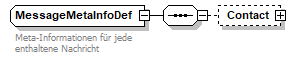 source | <xsd:complexType name="MessageMetaInfoDef"> <xsd:annotation> <xsd:documentation xml:lang="DE">Meta-Informationen für jede enthaltene Nachricht</xsd:documentation> <xsd:documentation xml:lang="EN">Meta information for each message.</xsd:documentation> </xsd:annotation> <xsd:sequence> <xsd:element name="Contact" type="ContactDef" minOccurs="0"/> </xsd:sequence> </xsd:complexType> |