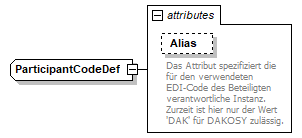 source | <xsd:complexType name="ParticipantCodeDef"> <xsd:simpleContent> <xsd:extension base="ParticipantCode"> <xsd:attribute name="Alias" use="optional" default="DAK"> <xsd:annotation> <xsd:documentation xml:lang="DE">Das Attribut spezifiziert die für den verwendeten EDI-Code des Beteiligten verantwortliche Instanz. Zurzeit ist hier nur der Wert 'DAK' für DAKOSY zulässig.</xsd:documentation> <xsd:documentation xml:lang="EN">Alias code. Describes how the participant is identified in a system, e.g. DAK as DAKOSY-code. Other identifiers are not specified yet.</xsd:documentation> </xsd:annotation> <xsd:simpleType> <xsd:restriction base="xsd:token"> <xsd:minLength value="1"/> <xsd:maxLength value="17"/> </xsd:restriction> </xsd:simpleType> </xsd:attribute> </xsd:extension> </xsd:simpleContent> </xsd:complexType> |