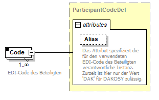 source | <xsd:element name="Participants"> <xsd:annotation> <xsd:documentation xml:lang="DE">es können max.11 Beteiligte kommuniziert werden. Bei Kommunikationen mit DAKOSY sind Beteiligte mit der Rolle 'Sender' (Absender) und 'Recipient' (Empfänger) Pflicht.</xsd:documentation> <xsd:documentation xml:lang="EN">Up to 11 entries can be sent:</xsd:documentation> <xsd:documentation xml:lang="EN">SENDER - mandatory with DAKOSY-code</xsd:documentation> <xsd:documentation xml:lang="EN">RECIPIENT - mandatory with DAKOSY-Code. Maximum of nine entries is possible.</xsd:documentation> <xsd:documentation xml:lang="EN">EDI_PROVIDER</xsd:documentation> </xsd:annotation> <xsd:complexType> <xsd:sequence> <xsd:element name="Participant" type="ParticipantDef" minOccurs="2" maxOccurs="11"/> </xsd:sequence> </xsd:complexType> </xsd:element> |