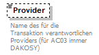 source | <xsd:element name="Provider" minOccurs="0"> <xsd:annotation> <xsd:documentation xml:lang="DE">Name des für die Transaktion verantwortlichen Providers (für AC03 immer DAKOSY)</xsd:documentation> <xsd:documentation xml:lang="EN">name of the party who is responsible for the underlying schema.</xsd:documentation> </xsd:annotation> <xsd:simpleType> <xsd:restriction base="xsd:string"> <xsd:minLength value="1"/> <xsd:maxLength value="35"/> </xsd:restriction> </xsd:simpleType> </xsd:element> |