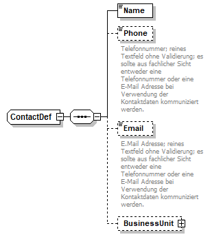 source | <xsd:complexType name="ContactDef"> <xsd:sequence> <xsd:element name="Name"> <xsd:simpleType> <xsd:restriction base="xsd:string"> <xsd:minLength value="1"/> <xsd:maxLength value="35"/> </xsd:restriction> </xsd:simpleType> </xsd:element> <xsd:element name="Phone" minOccurs="0"> <xsd:annotation> <xsd:documentation xml:lang="DE">Telefonnummer; reines Textfeld ohne Validierung; es sollte aus fachlicher Sicht entweder eine Telefonnummer oder eine E-Mail Adresse bei Verwendung der Kontaktdaten kommuniziert werden.</xsd:documentation> <xsd:documentation xml:lang="EN">plain text without validation. Either phone number or e-mail address must be filled if the user-element is transmitted.</xsd:documentation> </xsd:annotation> <xsd:simpleType> <xsd:restriction base="xsd:string"> <xsd:maxLength value="35"/> </xsd:restriction> </xsd:simpleType> </xsd:element> <xsd:element name="Email" minOccurs="0"> <xsd:annotation> <xsd:documentation xml:lang="DE">E.Mail Adresse; reines Textfeld ohne Validierung; es sollte aus fachlicher Sicht entweder eine Telefonnummer oder eine E-Mail Adresse bei Verwendung der Kontaktdaten kommuniziert werden.</xsd:documentation> <xsd:documentation xml:lang="EN">plain text without validation. Either phone number or e-mail address must be filled if the user-element is transmitted.</xsd:documentation> </xsd:annotation> <xsd:simpleType> <xsd:restriction base="xsd:string"> <xsd:maxLength value="70"/> </xsd:restriction> </xsd:simpleType> </xsd:element> <xsd:element name="BusinessUnit" type="BusinessUnitDef" minOccurs="0"/> </xsd:sequence> </xsd:complexType> |