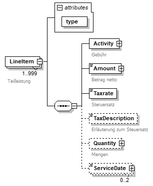 source | <xs:element name="LineItem" maxOccurs="999"> <xs:annotation> <xs:documentation>Teilleistung</xs:documentation> </xs:annotation> <xs:complexType> <xs:sequence> <xs:element name="Activity"> <xs:annotation> <xs:documentation>Gebühr</xs:documentation> </xs:annotation> <xs:complexType> <xs:sequence> <xs:element name="Code" type="anyCode" minOccurs="0"> <xs:annotation> <xs:documentation>Gebührencode</xs:documentation> <xs:documentation>Codeliste nach bilateraler Vereinbarung der Kommunikationsteilnehmer</xs:documentation> </xs:annotation> </xs:element> <xs:element name="Description" type="xs:string" minOccurs="0"> <xs:annotation> <xs:documentation>Gebührenbeschreibung</xs:documentation> </xs:annotation> </xs:element> </xs:sequence> </xs:complexType> </xs:element> <xs:element name="Amount" type="amount"> <xs:annotation> <xs:documentation>Betrag netto</xs:documentation> </xs:annotation> </xs:element> <xs:element name="Taxrate" type="tax"> <xs:annotation> <xs:documentation>Steruersatz</xs:documentation> </xs:annotation> </xs:element> <xs:element name="TaxDescription" type="xs:string" minOccurs="0"> <xs:annotation> <xs:documentation>Erläuterung zum Steuersatz</xs:documentation> </xs:annotation> </xs:element> <xs:element name="Quantity" minOccurs="0"> <xs:annotation> <xs:documentation>Mengen</xs:documentation> </xs:annotation> <xs:complexType> <xs:sequence minOccurs="0"> <xs:element name="TotalQuantity" type="quantity" minOccurs="0"> <xs:annotation> <xs:documentation>Menge</xs:documentation> </xs:annotation> </xs:element> <xs:element name="ChargedQuantity" type="quantity" minOccurs="0"> <xs:annotation> <xs:documentation>Kostenbelastete Menge</xs:documentation> </xs:annotation> </xs:element> <xs:element name="UnitPrice" type="amount" minOccurs="0"> <xs:annotation> <xs:documentation>Einzelpreis</xs:documentation> </xs:annotation> </xs:element> </xs:sequence> </xs:complexType> </xs:element> <xs:element name="ServiceDate" minOccurs="0" maxOccurs="2"> <xs:complexType> <xs:simpleContent> <xs:extension base="xs:date"> <xs:attribute name="timing" type="timeProperty" use="optional"/> </xs:extension> </xs:simpleContent> </xs:complexType> </xs:element> </xs:sequence> <xs:attribute name="type" use="required"> <xs:simpleType> <xs:restriction base="xs:NMTOKEN"> <xs:enumeration value="Bill"/> <xs:enumeration value="Rebate"/> </xs:restriction> </xs:simpleType> </xs:attribute> </xs:complexType> </xs:element> |
