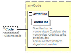 source | <xs:element name="Code" type="anyCode" minOccurs="0"> <xs:annotation> <xs:documentation>Gebührencode</xs:documentation> <xs:documentation>Codeliste nach bilateraler Vereinbarung der Kommunikationsteilnehmer</xs:documentation> </xs:annotation> </xs:element> |