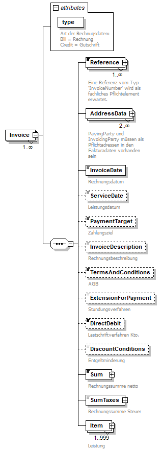 children | Reference AddressData InvoiceDate ServiceDate PaymentTarget InvoiceDescription TermsAndConditions ExtensionForPayment DirectDebit DiscountConditions Sum SumTaxes Item | ||||||||||||||