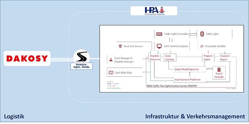 Das gezielte Data-Sharing haben die Projektpartner nicht nur im Bereich der Straße, sondern für alle Verkehrsträger im Hamburger Hafen geplant. Ein besonderes Augenmerk bekommen darüber hinaus die Im- und Exportabwicklung sowie die Verkehrsflussoptimierung auf dem Straßennetz im Hafen. Für die letztere Maßnahme wird eine quanten-inspirierte Technologie zur Echtzeitsteuerung des Ampelnetzes aufgebaut. „Mit der Methode des sogenannten Quantum-Annealing werden wir unter anderem in Sekundenschnelle eine hafenweit abgestimmte Ampelsteuerung errechnen können“, nennt Zuesongdham einen der angestrebten Meilensteine.